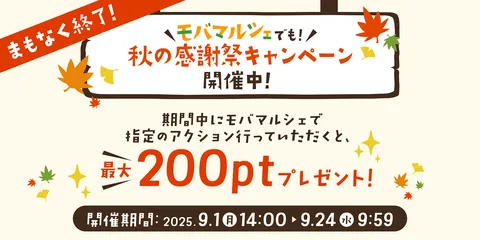 【9/24(水)9:59まで】\モバマルシェでも!/秋の感謝祭キャンペーン開催中! こんにちは!モバマルシェ運用担当です。2025年9月1日(月)14時より、モバオクでは「秋の感謝祭」を開催しています🍁モバオクスタンプラリーや特別オークションなど、目玉企画が盛りだくさんです。「モバオク秋の感謝祭」の詳細はこちらからご確認ください♪同じく、モバマルシェでも秋の感謝祭キャンペーンを開催